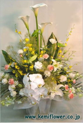 黄色のオンシジュウムがアクセント。 いつものお供えに少しあきたら いかがですか?