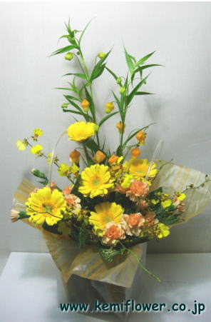普通の花器ではなく、バックの形の器に 活けた可愛らしいアレンジメントです。 ボリュームもありギフトにオススメです。