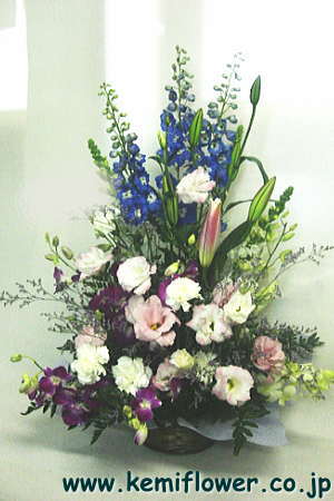 生花のアレンジです。 エアコンの風や直射日光があたる場所を避けて置いてください。 毎日お水を足すと長くお楽しみ頂けます。 お水は花器に直接足してください。